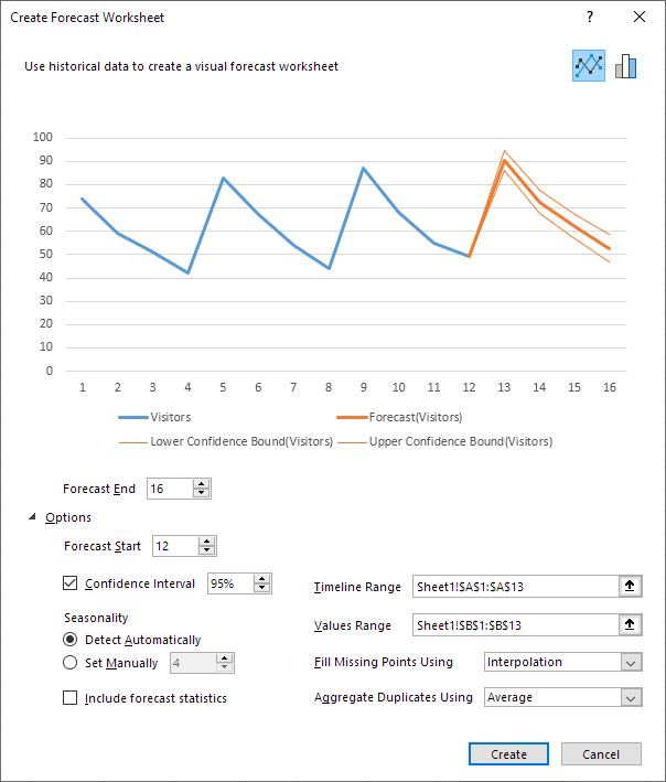 Excel 2016 이상에서 예측 시트 도구를 사용 하여 시각적 예측 워크시트를 자동으로 생성합니다.