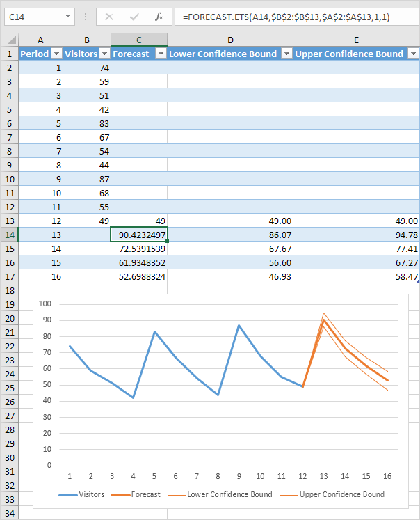 이 도구는 FORECAST.ETS 함수를 사용하고 동일한 미래 값을 계산합니다. 하한 및 상한 신뢰 범위는 좋은 보너스입니다.