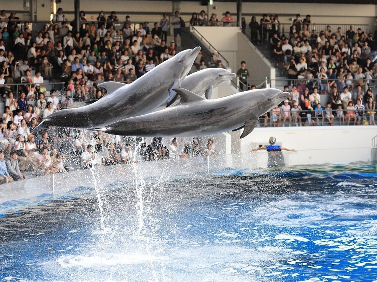 야외 공연장에서 하루에 여러 차례 돌고래 쇼가 열립니다. 쇼는 일본어로 진행되지만 돌고래의 아름답고 우아한 모습을 감상하는 데는 번역이 굳이 필요하지 않습니다. 점심 도시락을 미리 준비해 쇼 시작 전에 공연장에서 소풍을 즐기는 사람들도 많지만, 바다 테마의 간식을 구입할 수도 있습니다.