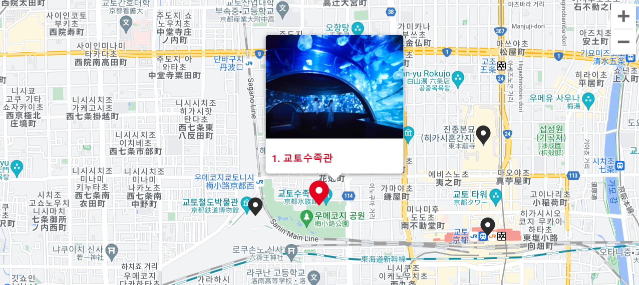 교토역에서 수족관까지 택시를 타거나 도보로 갈 수 있습니다.