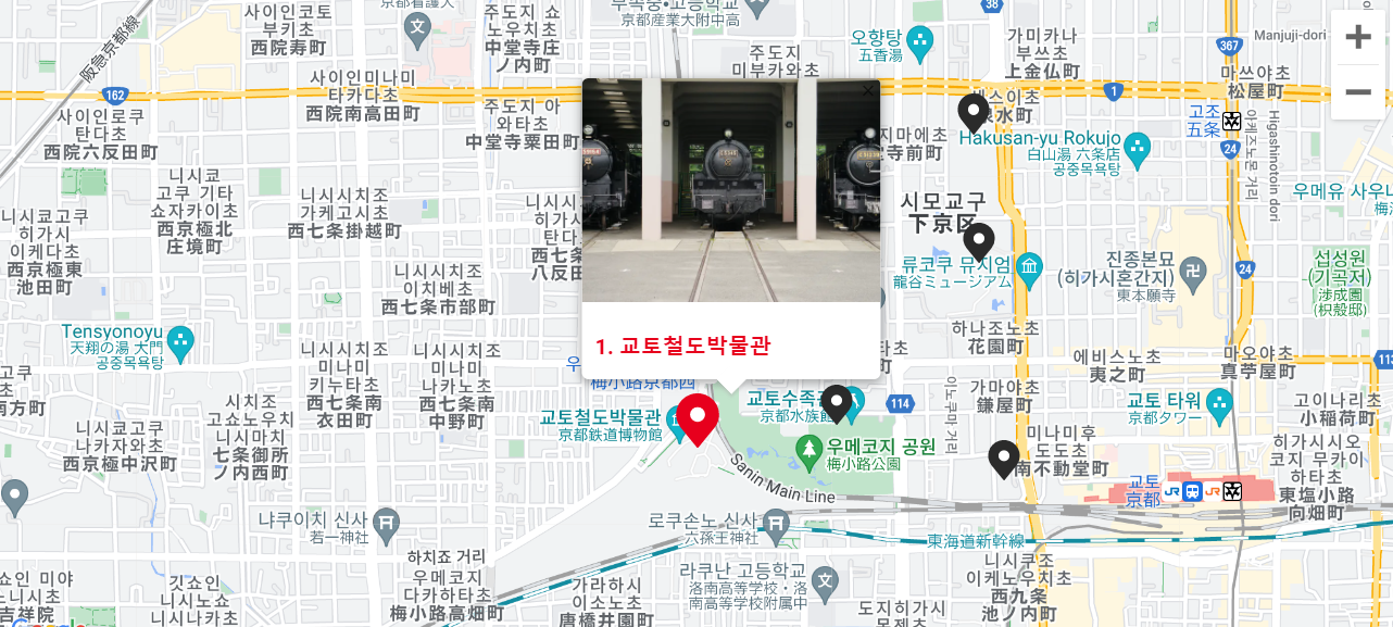 중앙 출구에서 철도 박물관까지는 걸어서 20분 정도 걸립니다. 도보 이동 외에도 103, 104, 110, 86, 88번 버스 중 하나를 타고 교토 철도박물관 정류장에 내리면 박물관 바로 앞에 도착합니다.