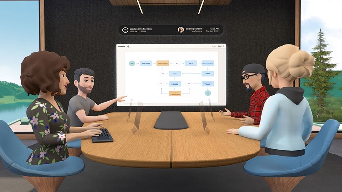 이러한 종류의 직장 '솔루션'을 사용하려면 VR 헤드셋과 아바타를 구매해야 합니다. 동료들의 만화 같은 얼굴을 보는 것이 생산성을 높일 것이라고 생각하는 과정입니다. 좋은 아이디어입니다. 메타버스에서 사람들은 자신이 어딘가에 있는 것처럼 느낄 필요가 있습니다. 작업과 관련하여 수십 년에 걸친 연구에 따르면 실제 존재가 없을 때 텔레프레즌스가 음성 전용보다 우수합니다.