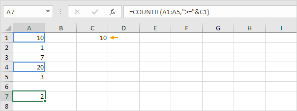 3. 아래의 COUNTIF 함수는 10보다 크거나 같은 셀의 수를 계산합니다.