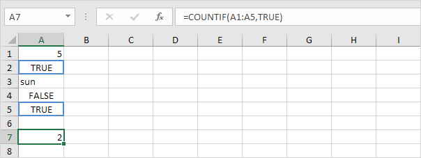 1. 아래의 COUNTIF 함수는 부울 TRUE를 포함하는 셀의 수를 계산합니다.