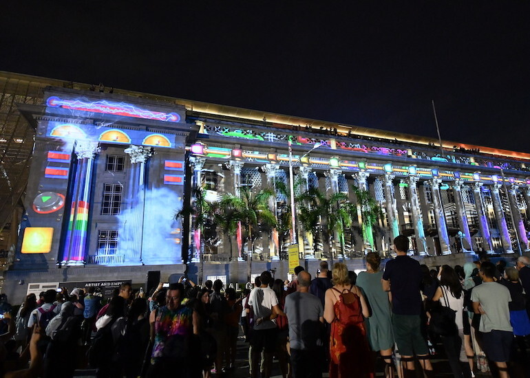 에스플러네이드에는 건축물과 같은 두리안이 있습니다. 아래에 있는 동안 무료 단편 영화와 음악 이벤트를 주최하는 Theatres on the Bay를 꼭 방문하세요.