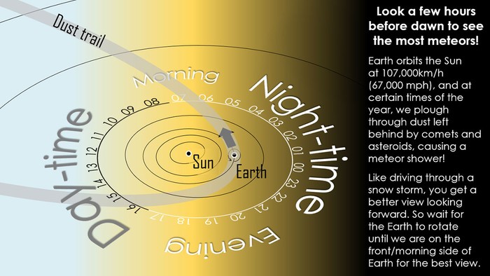 "눈보라가 몰아칠 때 자동차를 운전하는 것과 비슷합니다. 눈보라가 차 앞유리에 부딪힐 때 뒤에서 보는 것보다 앞을 더 잘 볼 수 있습니다."라고 그는 말합니다. "그리고 우리는 오전 6시에 태양 주위를 도는 우주 공간을 비행할 때 지구의 '앞'에 있으므로 날씨가 허락하는 한 자정 이후 몇 시간 동안 더 잘 볼 수 있을 것입니다!"