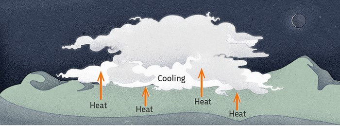 수증기가 많이 포함된 따뜻한 공기가 갑자기 식으면 물 분자가 너무 느려져서 증기 형태로 머물 수 없습니다. 대신에, 그것들은 함께 뭉쳐서 작은 액체 방울로 뭉칩니다. 물방울은 여전히 기류에 매달려 있을 만큼 충분히 작지만 이제 빛이 공기/물 계면에서 반사되기 때문에 불투명하게 보입니다.