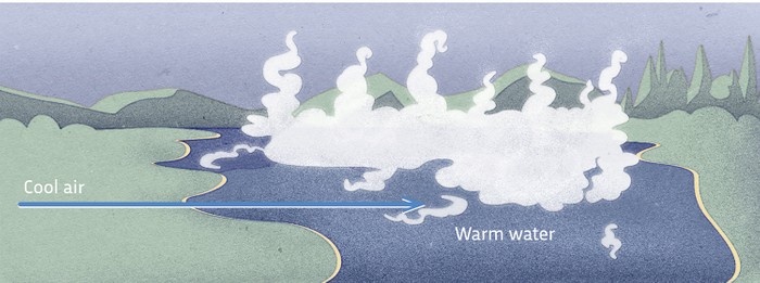 증발안개는 이류안개와 유사하며 찬 공기가 습한 땅이나 따뜻한 물 위로 지나가면서 형성됩니다. 따뜻한 물이 낮은 공기 띠로 증발하면 공기가 따뜻해지고 상승하게 됩니다. 이 따뜻하고 습한 공기가 상승하면서 습도가 100%에 도달할 때까지 찬 공기와 혼합되어 안개가 형성됩니다. 호수, 연못, 심지어 야외 수영장에서도 증발 안개가 자주 보입니다.