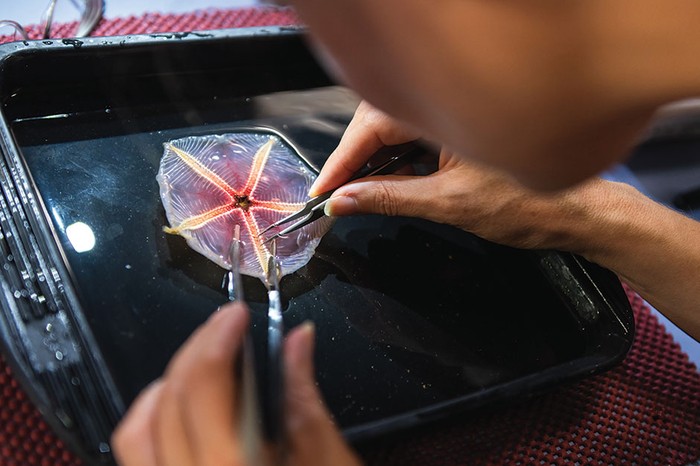 수석 과학자 Nerida Wilson 박사는 DNA 프로파일링을 위해 심해 불가사리의 일종인 hymenaster의 샘플을 채취합니다. © Greg Rouse Scripps Oceanography/Nerida Wilson/FK200308 팀