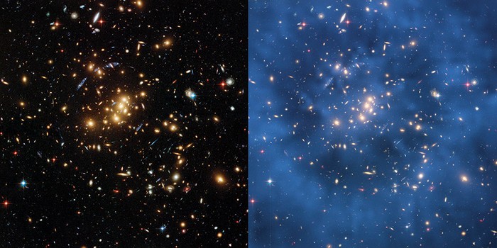 왜곡된 은하의 패턴을 연구한 후 천문학자들은 오른쪽 이미지에서 파란색으로 표시된 이 은하단 내 암흑 물질 지도를 만들었습니다.