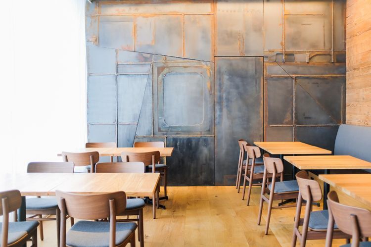 검고 광택이 느껴지는 레스토랑 내벽은 폐선박의 헌 철판을 재이용한 것으로, 심혈을 기울여 설계된 배색과 배치를 통해 차분하면서도 우아한 분위기를 연출하고 있습니다.