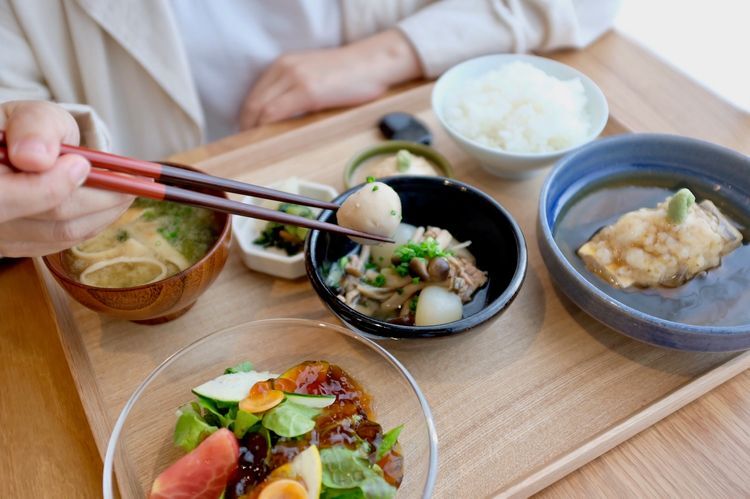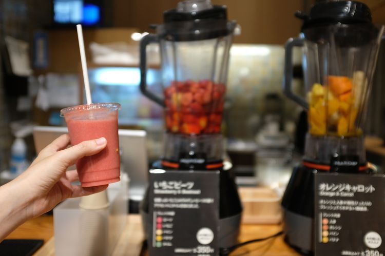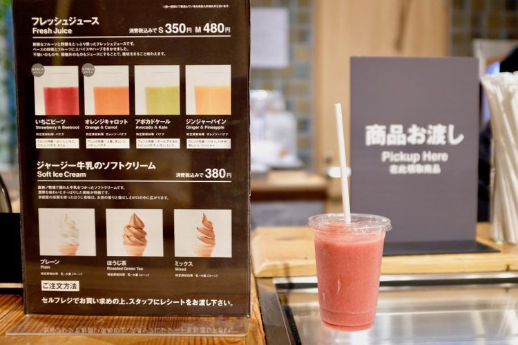 바로 옆에는 도시락 코너와 주스 스탠드도 있습니다. 매일 구성이 바뀌는 도시락은 식재료 본연의 맛을 잘 활용하여 화학조미료는 일체 쓰지 않은 안심・안전한 구성. 물론 그 고급스러운 맛 자체로도 폭넓은 지지를 받고 있습니다. 제철 채소와 과일을 써서 갓 짜낸 주스(S 350엔/M 480엔)는 재료 본연의 맛을 느낄 수 있으므로 건강을 생각하는 사람이나 활기찬 아침을 시작하고 싶은 사람에게 딱 맞는 메뉴일 것입니다.