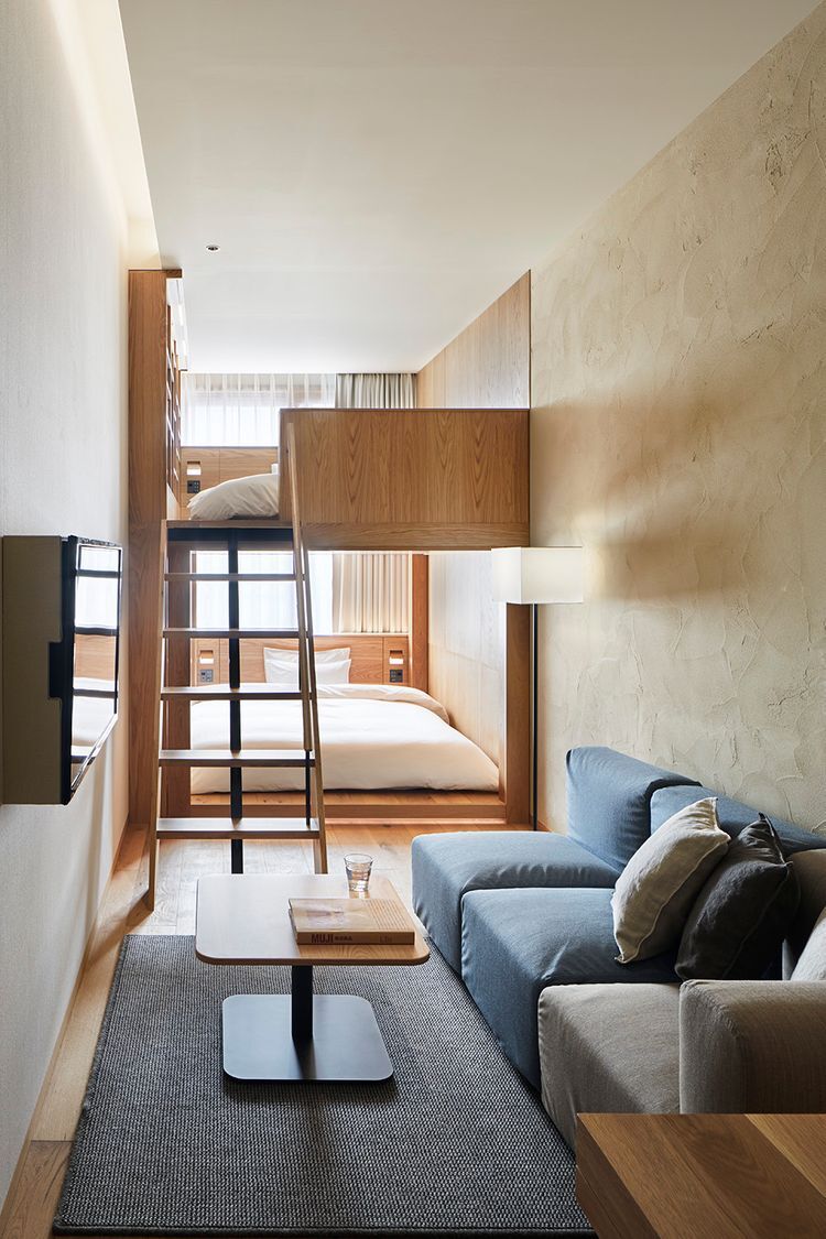 이어서 가족 단위에 적합한 TYPE G는 2층 침대가 있는 객실로, 최대 3명까지 숙박이 가능합니다. (3인이 숙박하는 경우 추가 요금 5,000엔. 1박 숙박비는 29,000엔 (1실)). 벽면에 있는 책장에는 '화조풍월'을 테마로 고른 서적들이 진열되어 있습니다.