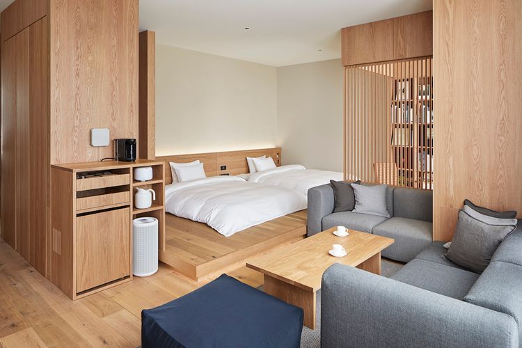 TYPE I는 MUJI HOTEL GINZA에서 가장 넓은 객실. 욕실은 고급스러운 히노키(편백나무) 욕조를 갖추고 있습니다. (더블베드 2대로 최대 4인까지 숙박 가능. 3인인 경우 5,000엔, 4인인 경우 10,000엔의 추가 요금 발생. 1박 숙박비는 55,900엔 (1실))