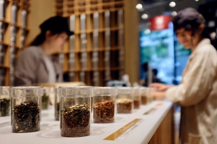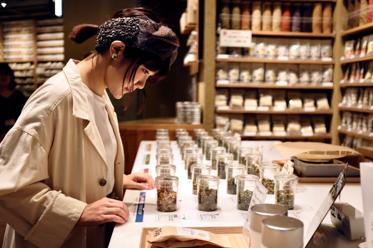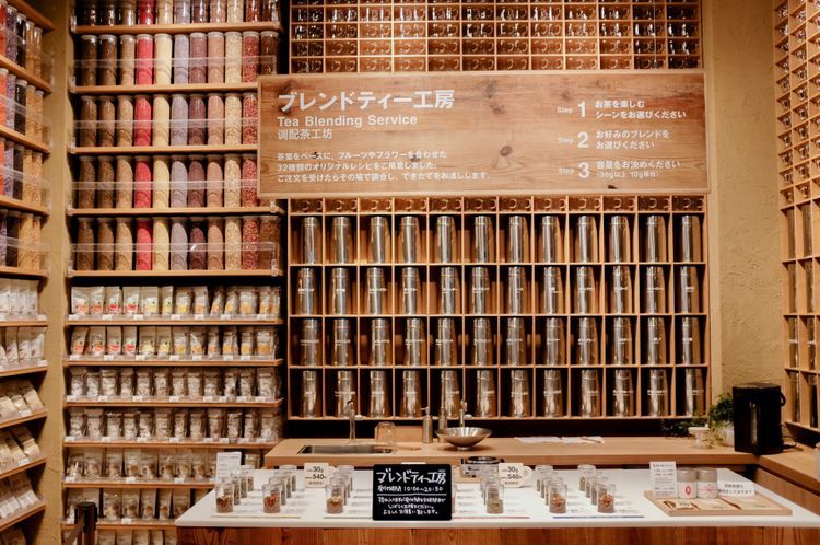 점포 내부로 발을 들여놓자마자 단번에 눈을 끄는 수많은 찻잎과 티백으로 가득 찬 커다란 목제 선반. 유기농 녹차, 유기농 호지차, 유기농 루이보스티 등 3종류를 기본으로 만드는 블렌드 티를 32종류 중량 판매하고 있습니다. '리프레시', '릴랙스', '식사와 함께', '잠들기 전' 등 상황과 취향에 맞춰 블렌딩 할 수 있으므로 이 서비스도 폭넓은 인기를 끌고 있습니다.