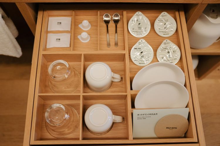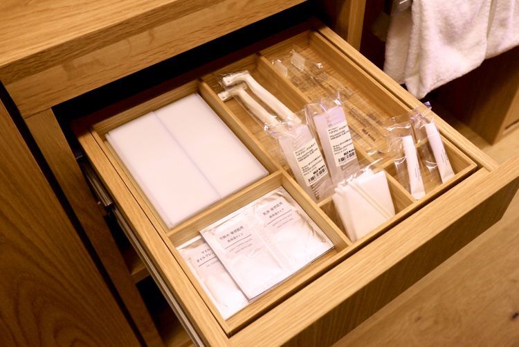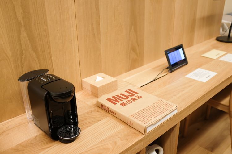 객실 조명 밝기, 에어컨 온도, 창문의 개폐를 모두 태블릿으로 조절할 수 있어서 편리합니다. 또한, 객실 내부에 있는 비품도 눈여겨볼만한 포인트. 티백, 칫솔, 스킨케어 용품, 파자마, 가습기까지 모두 무인양품의 제품들로만 구성되어 있습니다. 세안 용품 등 편의 용품 중의 일부는 가져가도 OK. 그 외에도 사용 후 마음에 드는 제품이 있었다면 바로 아래층들에 있는 매장에서 구입할 수 있다는 점도 인기의 비결입니다.