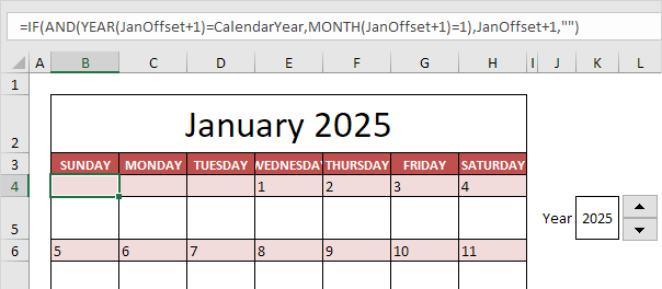 * 설명: JanOffset+4는 날짜에 불과합니다. 실은 2025년 1월 1일보다 (4~4)일 빨라요. 올해의 첫날입니다! 이 수식은 이 날짜의 연도가 CalendarYear이고 월이 1월(1)인지 확인합니다. 이것은 사실입니다! Excel은 날짜를 반환합니다.