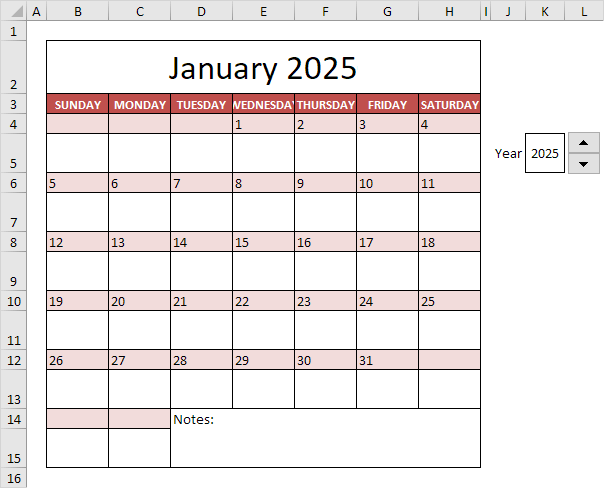 * 참고: 비슷한 방식으로 1월의 다른 날과 다른 달에 대한 수식을 만들 수 있습니다. 이 달력 도구를 사용하면 원하는 연도의 달력을 만들 수 있습니다! 달력 연도를 늘리려면 스핀 버튼을 사용하기만 하면 됩니다.