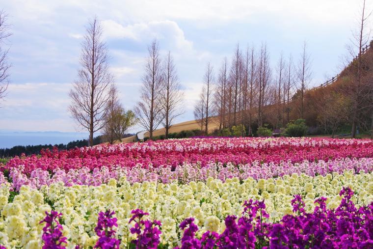 아와지시마 북부의 구릉지역에 있는 「아와지꽃사지키」. 아카시 해협과 오사카 만을 배경으로 사계절의 꽃의 파노라마를 즐길 수있는 장소입니다. 11월 중순부터 2월까지는 화이트, 퍼플, 핑크 등 다채로운 스톡 꽃이 만발합니다.