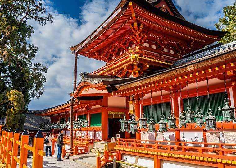 나라공원 내에 있는 「가스가타이샤」는 유네스코 세계유산 「고도 나라의 문화재」의 하나로 등록되어 있습니다. 창건은 768년, 헤이조쿄의 수호신으로서 만들어졌습니다. 선명한 주홍색이 인상적인 사전을 둘러싼 회랑에는 약 1,000기의 낚시 등롱이 늘어서 있습니다.