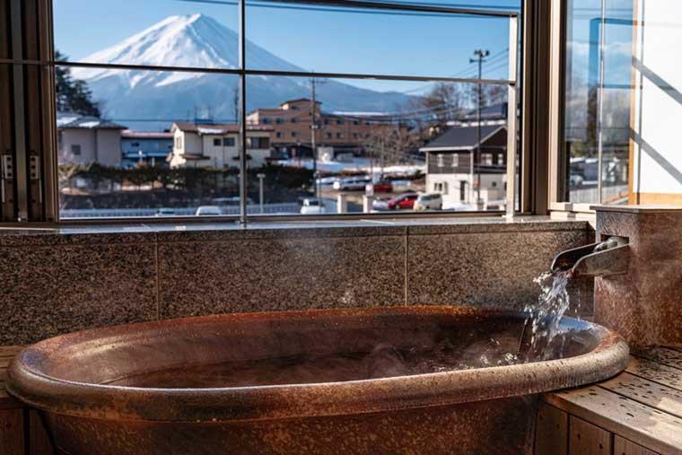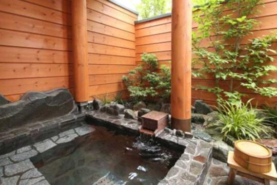 온천은 후지산의 지하 약 1,500m에서 솟아나는 가와구치코 온천의 따뜻한 물. 객실 노천 이외에도 미스트 사우나를 갖춘 대욕장이나 히노시와 바위 구조의 노천탕에서 즐길 수 있습니다. 후지산과 가와구치코를 바라보는 전세탕도 추천.