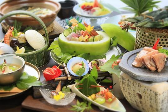 식사는, 전국에서 들여온 엄선된 제철 식재료로 만드는, 달 교체의 회석 요리. 아침 저녁 모두 개인실의 식당에서 느긋하게 즐길 수 있습니다.
