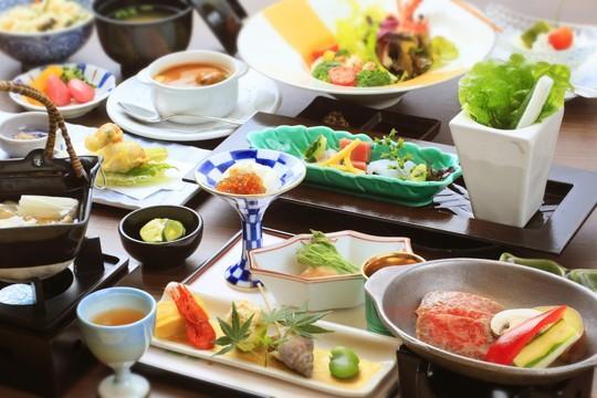 개인실의 식당, 혹은 방식에서 드실 수 있는 저녁 식사는 고슈 와인 비프 스테이크와 고슈 명물 호토나베가 메인 화회석이나 규슈산 곰 새우를 사용한 튀김 고선, 가고시마현산 활기찬 무게 등 다양한 플랜 준비. 조식에는 일본과 서양 중 약 70 종류의 뷔페가 인기입니다. 매일 밤 20:30 개최, 풍림 화산의 조용함과 움직임을 이미지 한 오리지널 곡이 연주되는 「경산 북 쇼」는 박력 만점!