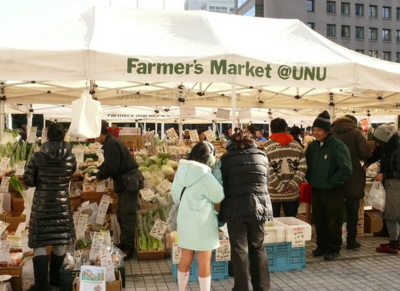 매주 토요일에는 유엔 대학교(国際連合大学, United Nations University) 앞에서 농산물 시장이 열립니다. 일본 전역의 농부들과 상인들이 부스를 설치하여 신선하고 맛있는 야채와 음식들을 팝니다. 중동의 채식 식품을 판매하는 푸드트럭과 홈메이드 브라질 치즈도 있습니다.