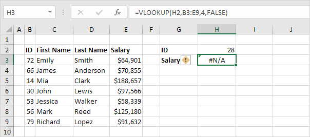4. 예를 들어 Excel은 VLOOKUP 함수 가 일치하는 항목을 찾을 수 없는 경우 #N/A 오류를 반환합니다.