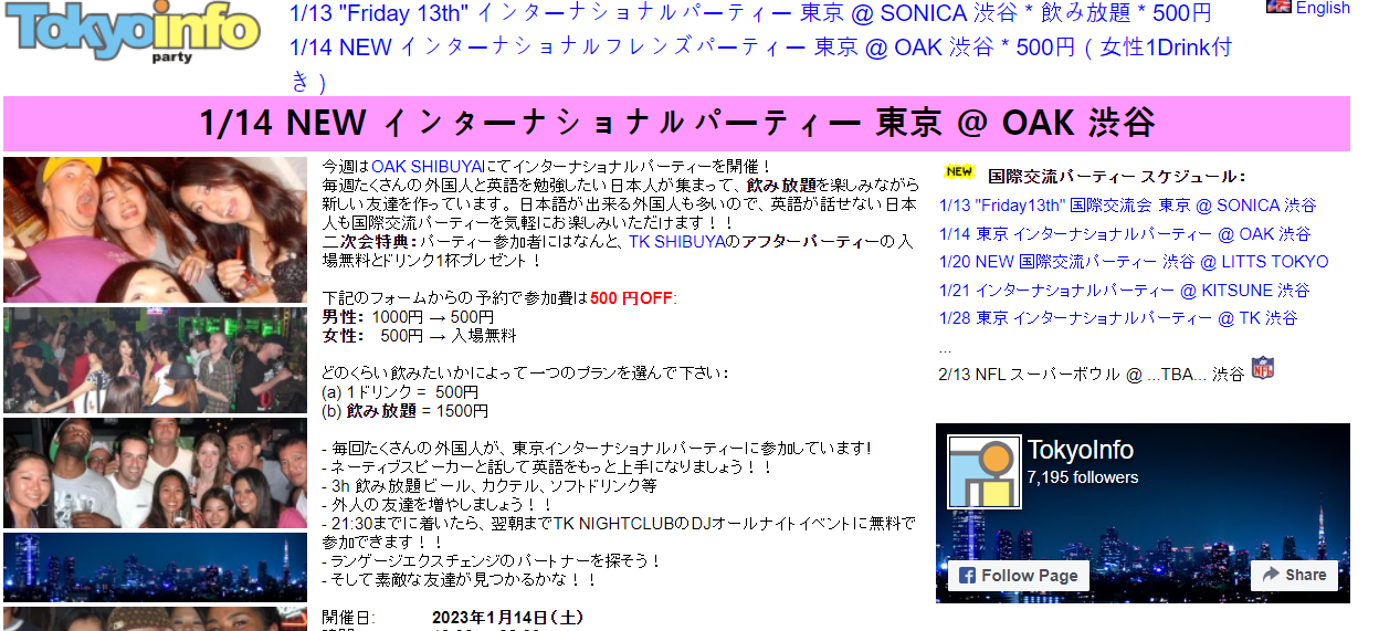 시부야에서 친구를 사귀고는 싶지만, 길거리를 지나가는 사람을 붙잡고 말 걸기에는 너무 부끄럽지요? 이런 분을 위한 파티가 있습니다! 도쿄 문화 교류회는 일본에서 아주 오랜 역사를 가진 인적 네트워크 파티입니다. 2015년 3월 기준으로 시부야에서 한 달에 한 번 토요일마다 개최하고 있습니다.