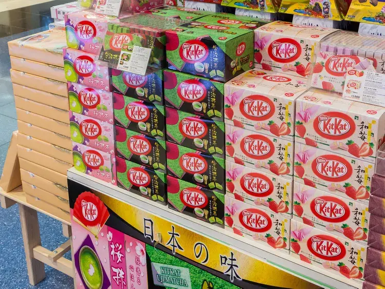 세계적으로 유명한 KitKat은 초콜릿 코팅으로 덮인 긴 직사각형 웨이퍼 층으로 구성되어 있으며 일본에서 매우 인기 있는 기념품입니다. 물론 KitKats는 전 세계에서 판매되지만 일본에는 말차 및 사케와 같은 독점적인 맛과 다양한 지역 및 한정판 품종이 있습니다. 기념품으로 인기 있는 것은 스틱이 개별 포장된 고급 버전인 KitKat Chocolatory입니다. 향이 풍부한 고급 커버츄어 초콜릿으로 만든 서브라임 비터 타입도 놓치지 마세요.