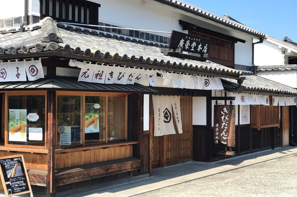 160년의 역사를 자랑하는 코에이도는 오카야마의 명물 기비당고를 전문으로 하는 노포 과자점입니다. 츄나곤 본점을 포함해 오카야마현 전역에 8개 점포가 있으며, 각 점포는 따뜻하고 친근한 복고풍 디자인입니다.