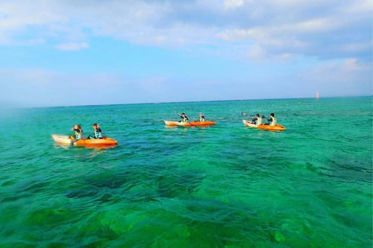 온나손에서는 강사의 강습으로 초보자도 안심하고 바다 카약에 도전할 수 있는 오키나와 온나손 바다 카약 투어 에 참가할 수 있습니다. 파도와 바람에 흔들리면서 코발트 블루의 바다를 맛 보는 것은?