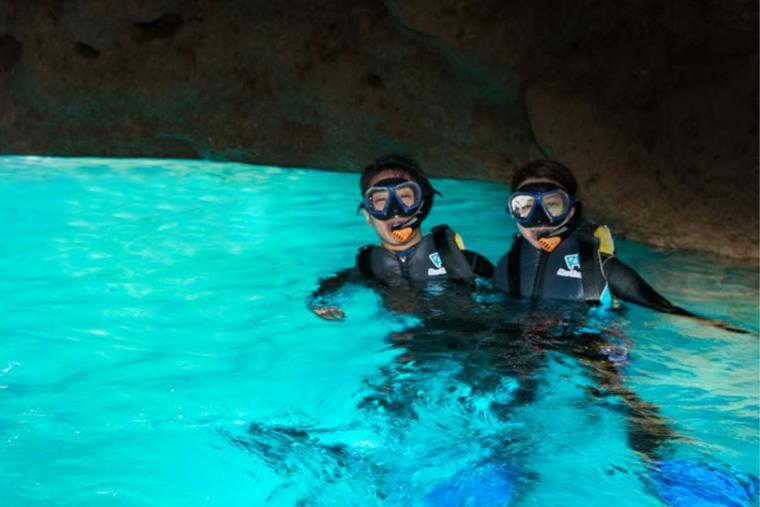 온나손 마에다 곶에 있는 인기 관광 명소 "푸른 동굴"에서 열리는 것이 오키나와 온나손 푸른 동굴 스노클링 체험 . 태양의 빛이 해저에 반사해, 수면이 파랗게 빛나는 환상적인 경치에 치유되는 것 틀림없음!