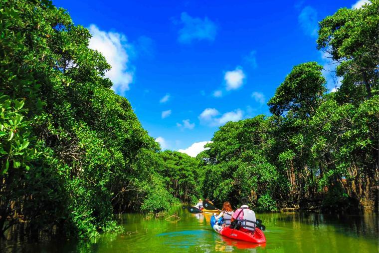 본섬 중부를 흐르는 억수천(오쿠쿠비가와)에서는, 여기에서만 볼 수 있는 4종류의 맹그로브의 나무를 관찰할 수 있는 오키나와 본섬·억수천 맹그로브 카약 투어 도. 기복이 풍부한 코스를 진행하면서 대자연을 만끽합시다.