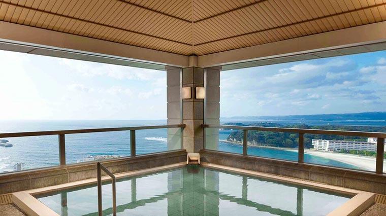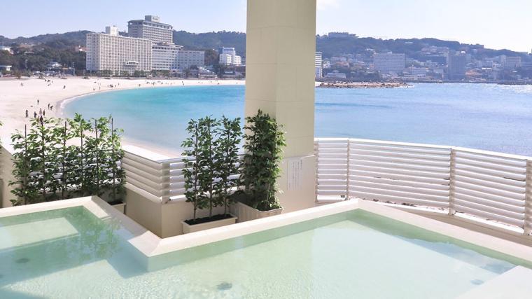 시라라하마에서 도보 약 3분 거리에 있는 「난키 시라하마 메리어트 호텔」 . 최상층의 11층에 있는 온천 대욕장·노천탕은 눈 아래에 태평양을 바라보고, 개방적인 기분으로 목욕을 즐길 수 있습니다.