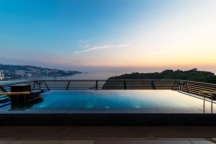 시라라하마의 눈앞에 서 있는 리조트 호텔 「호텔 산라쿠소」 는, 전실 오션 뷰로, 방으로부터의 절경이 인기의 포인트. 원천에 걸쳐 싱크대의 온천을 즐길 수 있는 노천탕이 있는 객실을 다수 준비하고 있습니다.