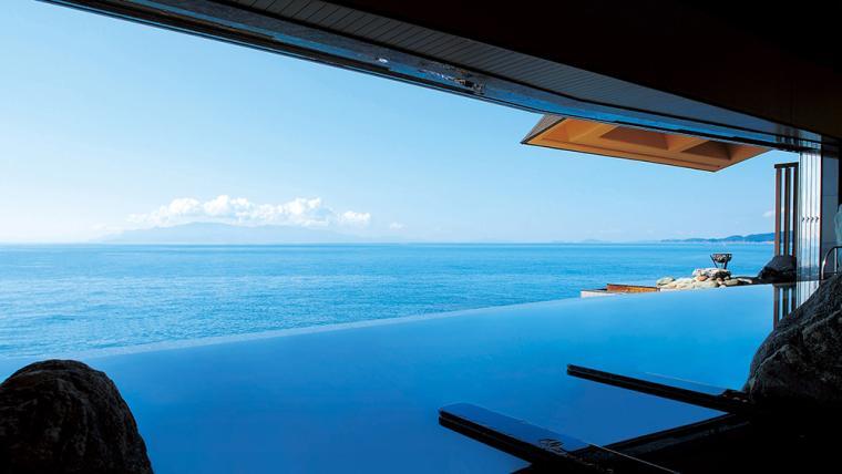 와카야마시의 세토나이카이 국립공원 내에 있는 온천 리조트 호텔 「큐우카손 기슈 가타」. 바다가 보이는 곳에 자리를 잡고 있어서 바다가 일체화한 것 같은 노천탕이 자랑입니다.