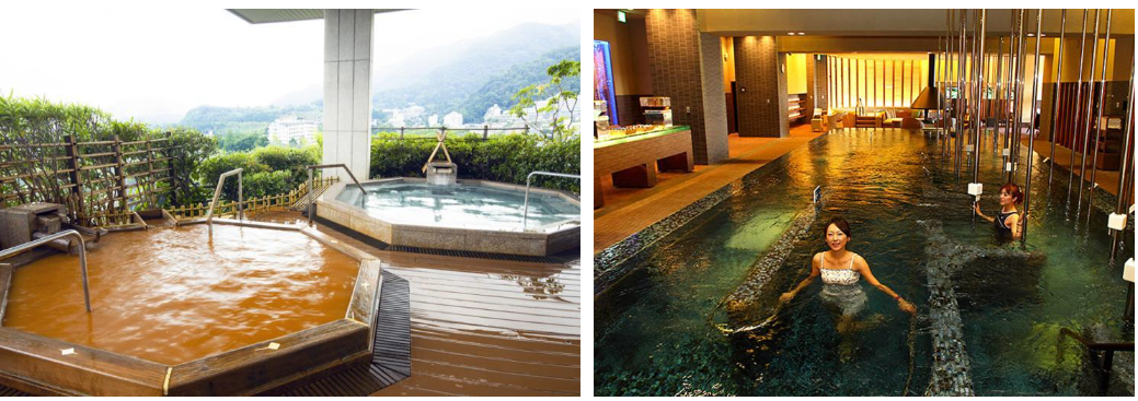 아리마 온천은 철분을 많이 포함한 다갈색의 '금천'과 무색 투명의 '은천', 2종류의 온수를 즐길 수 있으며,