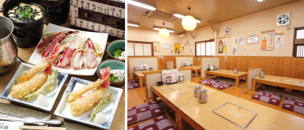 여름에는 대게, 겨울에는 홍게를 맛볼 수 있는 게 전문점입니다. 게는 숯불구이, 전골요리 등 다양한 방법으로 즐길 수 있지만 가장 호화로운 것은 튀김입니다. 전문점 밖에서는 쉽게 볼 수 없는 게튀김은 싱싱한 게살을 튀겨 은은하게 풍미를 더한 게튀김입니다. 메뉴에는 대게 숯불구이·튀김 코스(6,050엔)와 [대게 튀김·게 전골 코스](6,600엔) 등 코스 메뉴도 있어 게의 맛을 마음껏 즐길 수 있습니다.