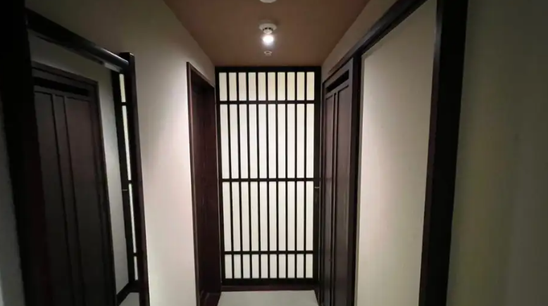 방의 입구는 슬라이드 도어, 열면 거실로 이어지는 또 하나의 문이 있는 구조였습니다.
