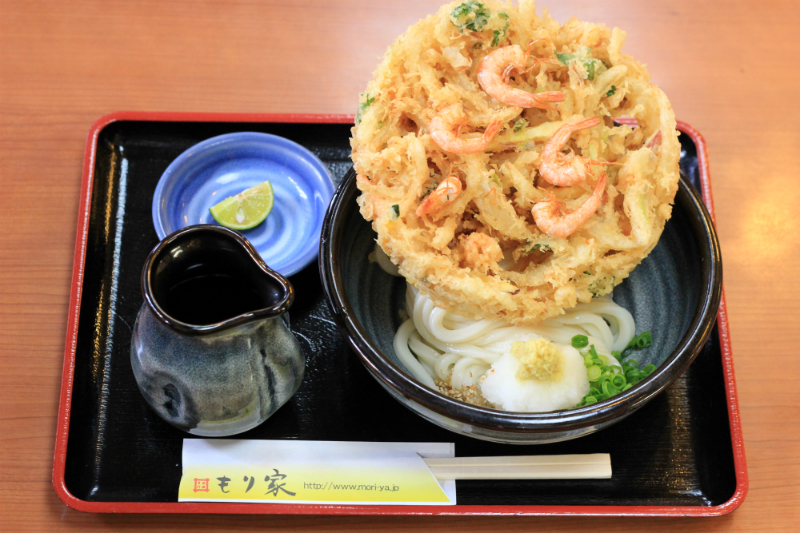 모리야 우동의 단면은 정사각형이 아닙니다. 오히려 네 귀퉁이를 향해 약간 휘어진 모양을 하고 있습니다. 더 탄력있는 질감을주기 위해 이런 식으로 모양이 만들어졌습니다. 시그니처 메뉴는 "가키아게 우동"(튀김이 있는 우동)입니다. 큰 가키아게는 두 가지 종류가 있습니다. 하나는 새우가 들어 있고 다른 하나는 안에 문어가 들어 있습니다.