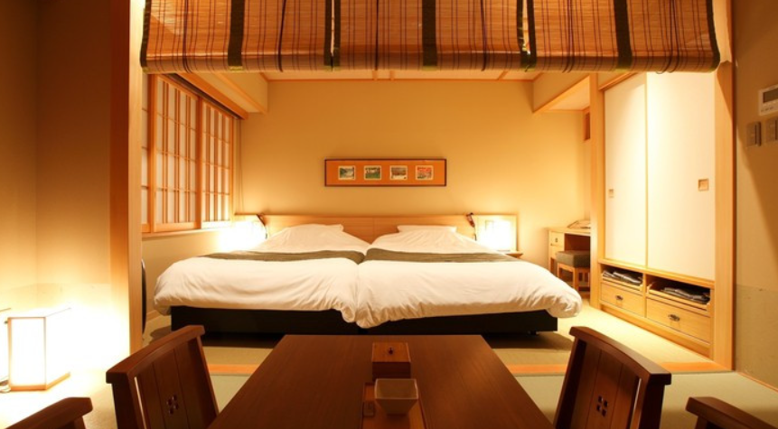 이쪽의 객실은 「노천탕 첨부 일본식 서양실」. 약 37평방미터의 넓은 객실입니다. 시몬스 사제의 침대가 2개 있어, 느긋하게 휴식을 취할 수 있습니다. 객실은 모두 일본의 정서 가득한 편안한 공간. 커플용의 갖추어진 색 유카타를 입고, 꼭 그와 여행의 기념 촬영을 해보는 것도 좋을것 같네요~
