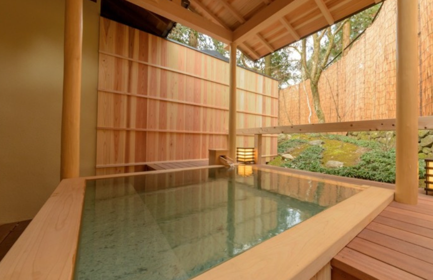이곳은 "노천탕이있는 일본식 서양식 방"의 객실 노천탕. 헤이안 귀족이 즐겼다고도 하는 아라시야마의 밤하늘을 바라보면서, 둘이서 천천히 들어갈 수 있어요. 그 외에도 노송나무의 반노천탕이 있는 객실도 마련되어 있습니다.