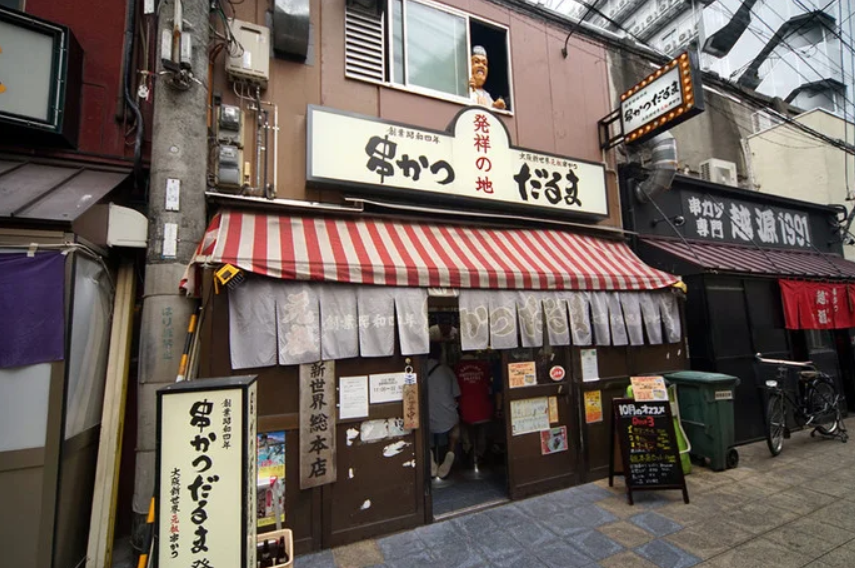 「다루마」는 쇼와 4년 창업이라고 하는 전통 꼬치 커틀릿 체인입니다. 오사카 시내에 여러 점포가 있어, 신세계의 「본점」은 장잔 요코초에서 츠텐카쿠로 향하는 신세계의 중심지에 있습니다. 점포 2층의 창문에서 들여다보는 아버지씨 인형이 트레이드 마크입니다.