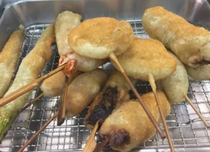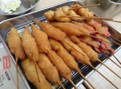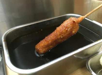 부드러운 옷에 달콤한 소스, 해산물 도구가 풍부한 꼬치 가게