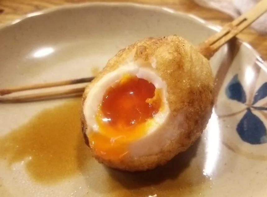 깔끔한 튀김 상태로 먹고 맛도 무겁지 않습니다. 야채, 해물, 고기 등의 꼬치가 20종류 정도 갖추어져 있습니다. 계란이 통째로 들어간 계란 튀김은 양도 푸짐합니다!