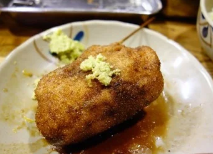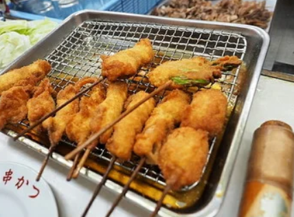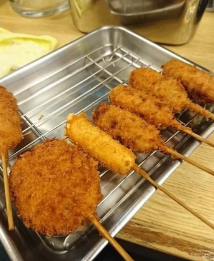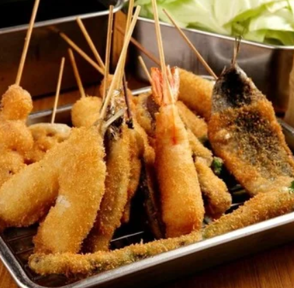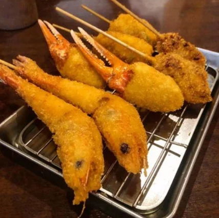 꼬치 커틀릿의 종류는 40종류 이상. 튀김옷은 매우 얇고 바삭바삭 튀김이 특징이며, 안쪽은 부드럽게 식감입니다. 새우와 게를 먹을때는 도구도 요청하면 제공됩니다.