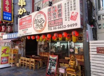 「카라사키 본점」은 츠텐카쿠 치카쿠의 꼬치 가게입니다. 방금전의 「오미야」의 바로 옆에 있습니다. 점내는 넓고 카운터와 테이블 좌석이 있어 혼자라도 눈치안보고 먹을수 있는 것이 장점! 2층에는 좌석석도 있으므로, 그룹 이용도 OK입니다.