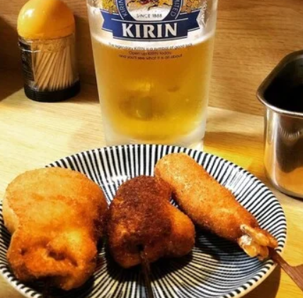 꼬치 커틀릿은 옷이 가볍고, 많이 먹어도 위에 부담이 안된다는 평이 많습니다. 또 소스가 일품입니다. 꼬치 커틀릿 외에도 가라아게, 주먹밥, 디저트 등 선술집 메뉴도 풍부합니다.